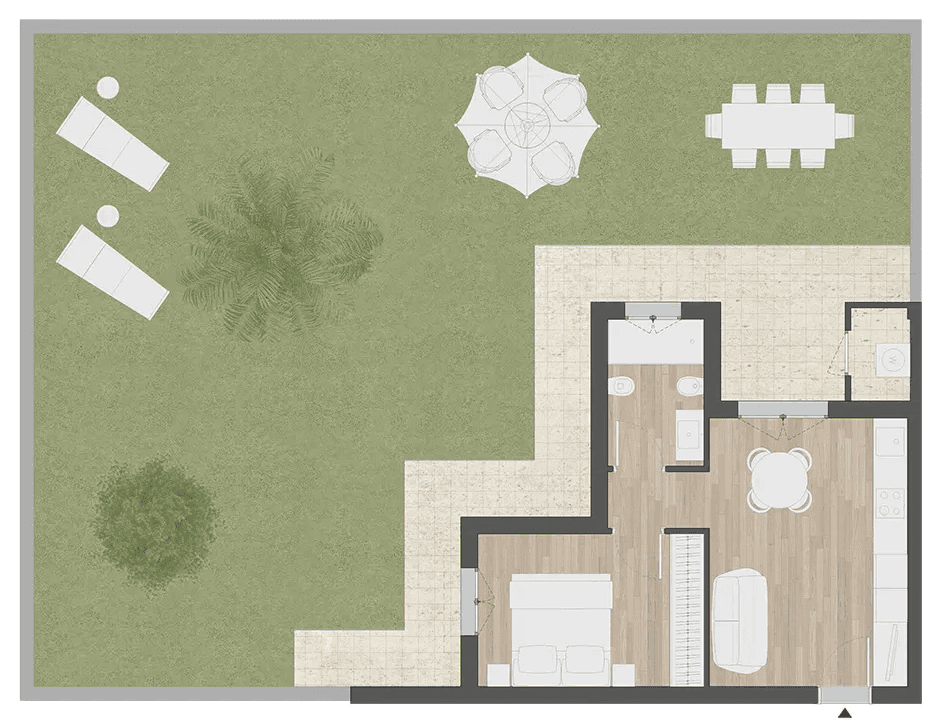 Le soluzioni al piano terra offrono giardini privati, mentre quelli ai piani superiori vantano ampie terrazze. Ogni residenza è pensata per garantire una vita all'aperto, arricchendo l'esperienza abitativa con spazi esterni esclusivi.
